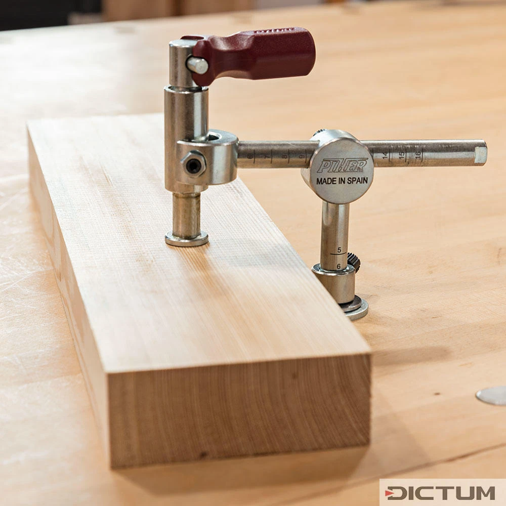 Développé à l’origine comme système de serrage pour les tables de soudage, le TCP offre de nombreuses caractéristiques qui sont autant d’avantages pour le travail du bois massif. Le serre-joint à pompe robuste offre une énorme force de compression et serre aussi bien les pièces de forme plate que les pièces de forme ronde. Le mécanisme du boulon de pression pivotant et inclinable peut être orienté dans presque toutes les positions. Comme le boulon de pression n’est pas entraîné pendant le serrage, cela empêche les pièces en bois encollées de s’écarter. Grâce à la grande mobilité du boulon de pression, le système de serrage est adapté aux objets organiques, aux rhizomes, aux bûches, etc. par exemple pour les travaux de sculpture. Ø de tige 16 mm. Douilles de réduction de Ø 25 mm et 30 mm à 16 mm, pour l’utilisation sur les bancs d’établi, disponibles comme accessoires. 25/16 mm N° 730097, 30/16 mm N° 730098.